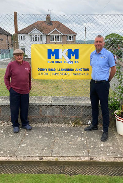 Konrad Roberts of MKM (on right in photo) with his company’s advertising banner at the Vardre Deganwy bowling green. Click Here to find out more about potential sponsorship.
