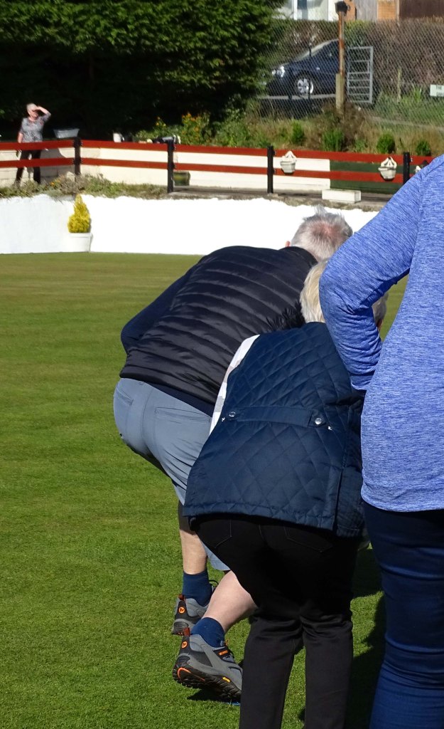Here Doreen demonstrates the “Cunning Crouch Ouch Position (C-COP)” to try and get the same perspective on David’s line of the jack and bowl. This technique is not often demonstrated on the green but perhaps it could set a trend for next season? Even Ann is impressed.
