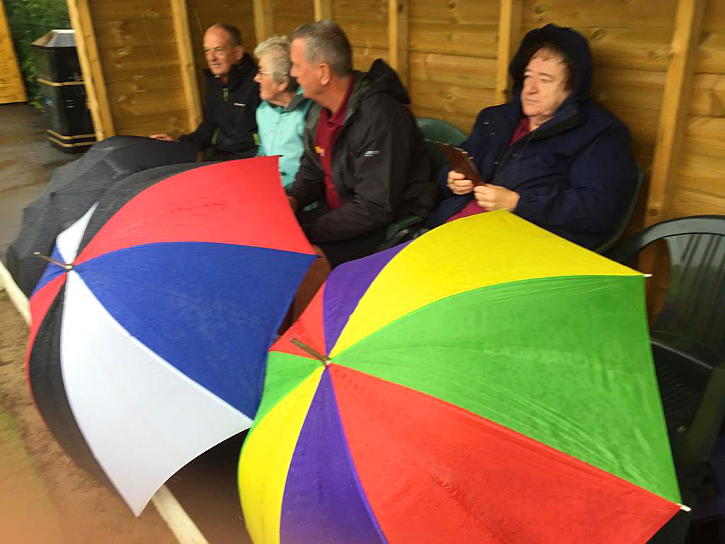 Our Clwydian ‘B’ Team considered battling the elements and managed to hide behind an array of large umbrellas to try and stay dry. However, beaten only by the weather, the match was called off so the team survives to play their semi-final another day. However, in Kinmel Bay, our ‘A’ Team battled through the rainstorm with everyone getting soaked through and cold, and ending up by losing out in their semi-final by 9-points.