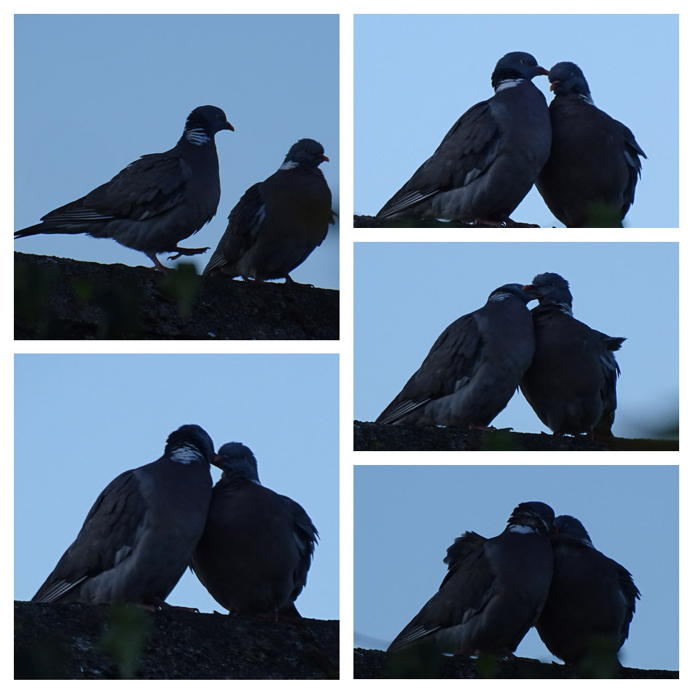 In other news: here’s a response to any cats on hot tin roofs – a few twilight and touching photos of a pair of courting woodpigeons on a cold tiled roof.