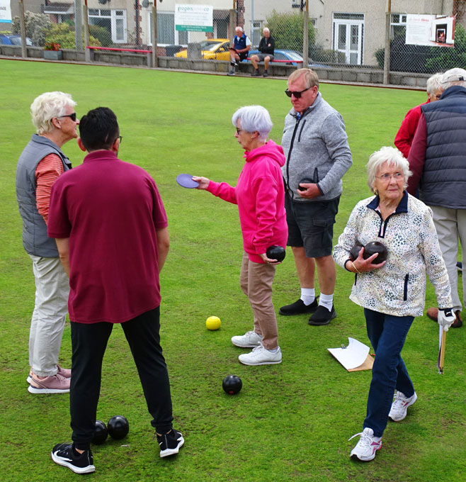 Ann concentrates hard and prepares herself as Maureen, Bradley and Geoff have just challenged her to frisbee the foot mat across the green so that it lands face-up on Ian’s clipboard.