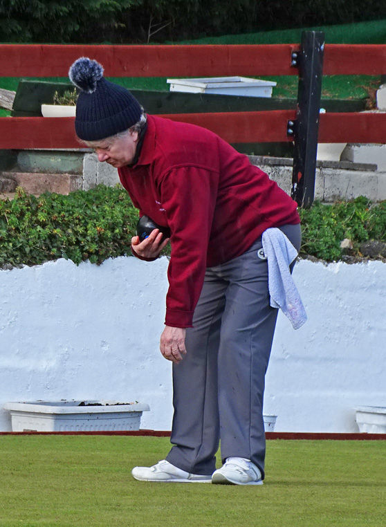 Gay practises her Rag Doll impression between ends on the green.