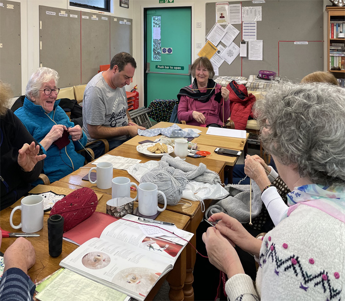 The Friday Craft and Social Group: Gay, Shan; Marina; Clarice; John F; Rosina; Sue and yet who’s that, hidden from view? Answers on a postcard please. Is it true that they are knitting and sewing a new Clubhouse?