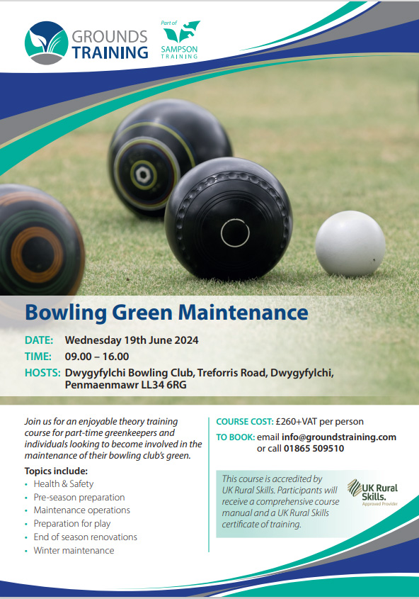 Green Train? Posted bybowlsjustroll25th April 202424th April 2024Posted inDiary, News & Events The WCGBA is advertising bowling green maintenance training to be held at Dwygyfylchi Bowling Club on 19th June 2024. See the promotional poster below. Share this: Click to share on X (Opens in new window) X Click to share on Facebook (Opens in new window) Facebook Click to share on WhatsApp (Opens in new window) WhatsApp Click to email a link to a friend (Opens in new window) Email Like Loading... Related