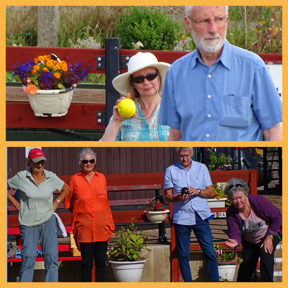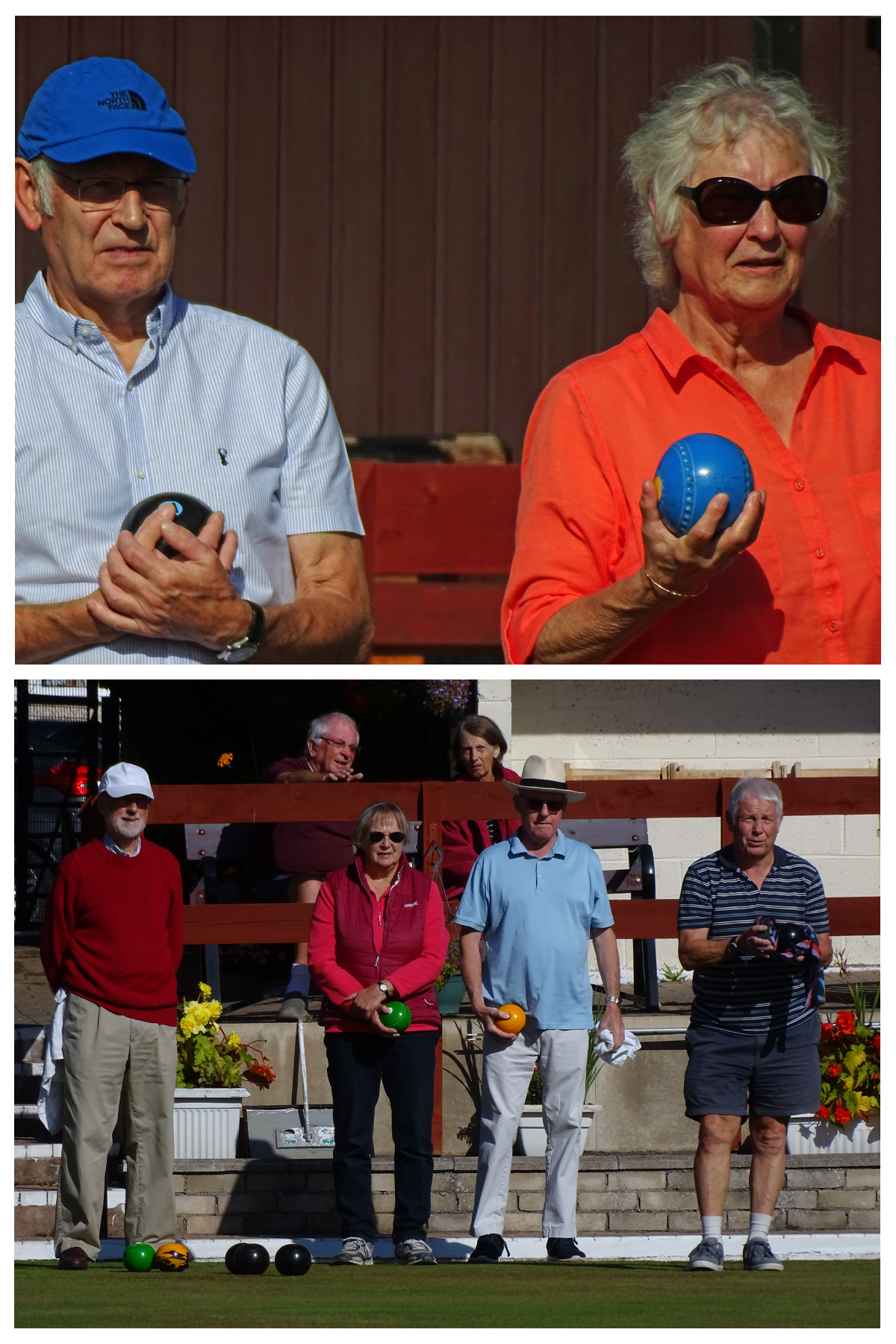 Our first FUN DAY of the season appeared to be fairly well appreciated last Sunday afternoon. 24 members were present at 1:25pm and, with a quick re-jiggle of entries, 4 teams of 6 players were made. This meant that play got underway about 5-minutes behind schedule followed by the explanation of rules for “FINGERS & THUMBS” and the simplified scoring system explained. With 4 teams, and competition limited to just 8-ends, it meant all players were active for approximately 30 minutes, then rested for the next half an hour, before moving on to the next challenge. A sudden shower just after 2pm brought play to a brief halt, but allowed all present the opportunity to sample Bob’s bara brith and Shirley’s lemon drizzle cake with a hot brew. In addition, there was the “football card” draw, which new member Richie Foster had sponsored with a £20 prize: £10 for the winner and two runners-up winning £5 each. Thanks to all 3 for their generous donations to the proceedings.