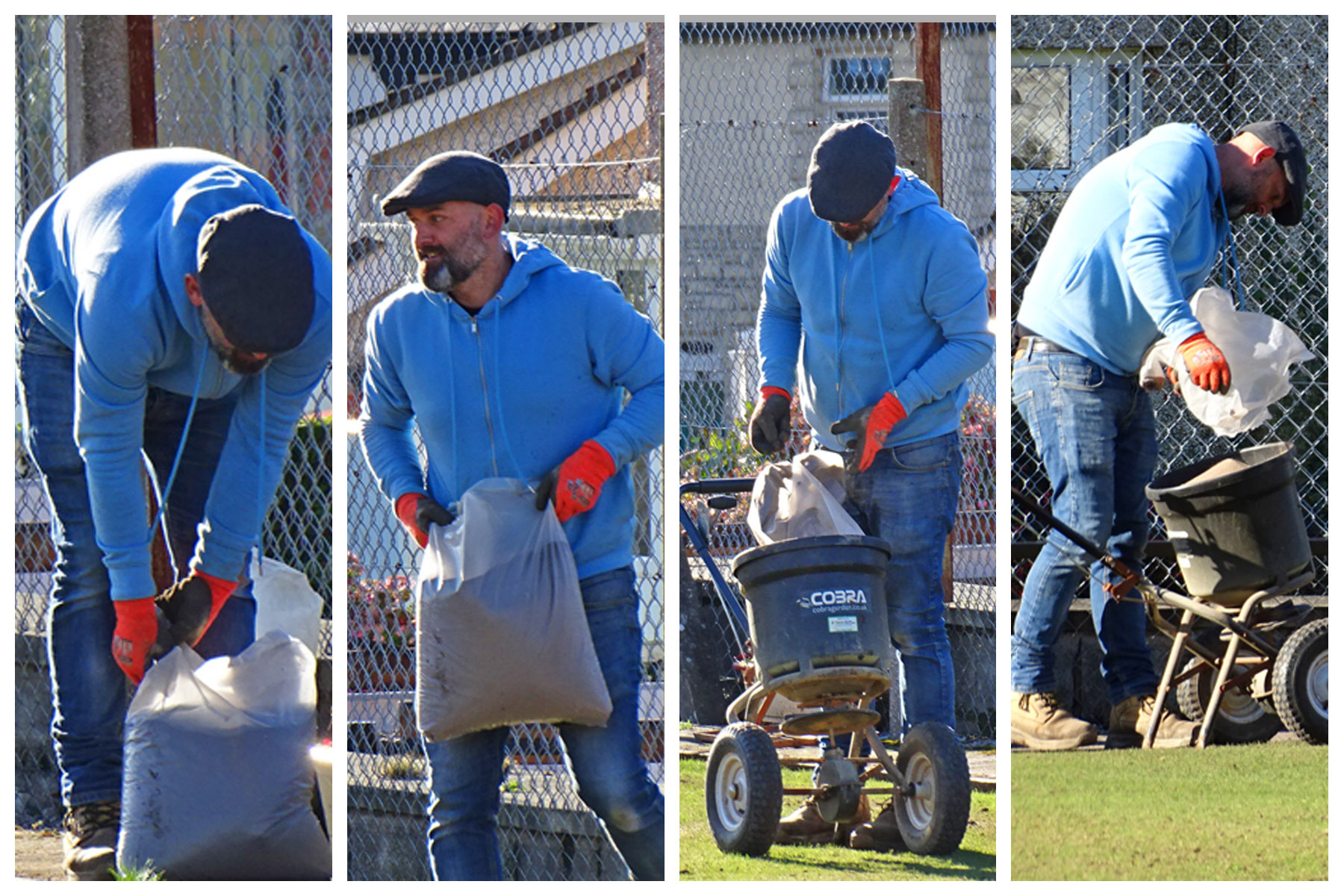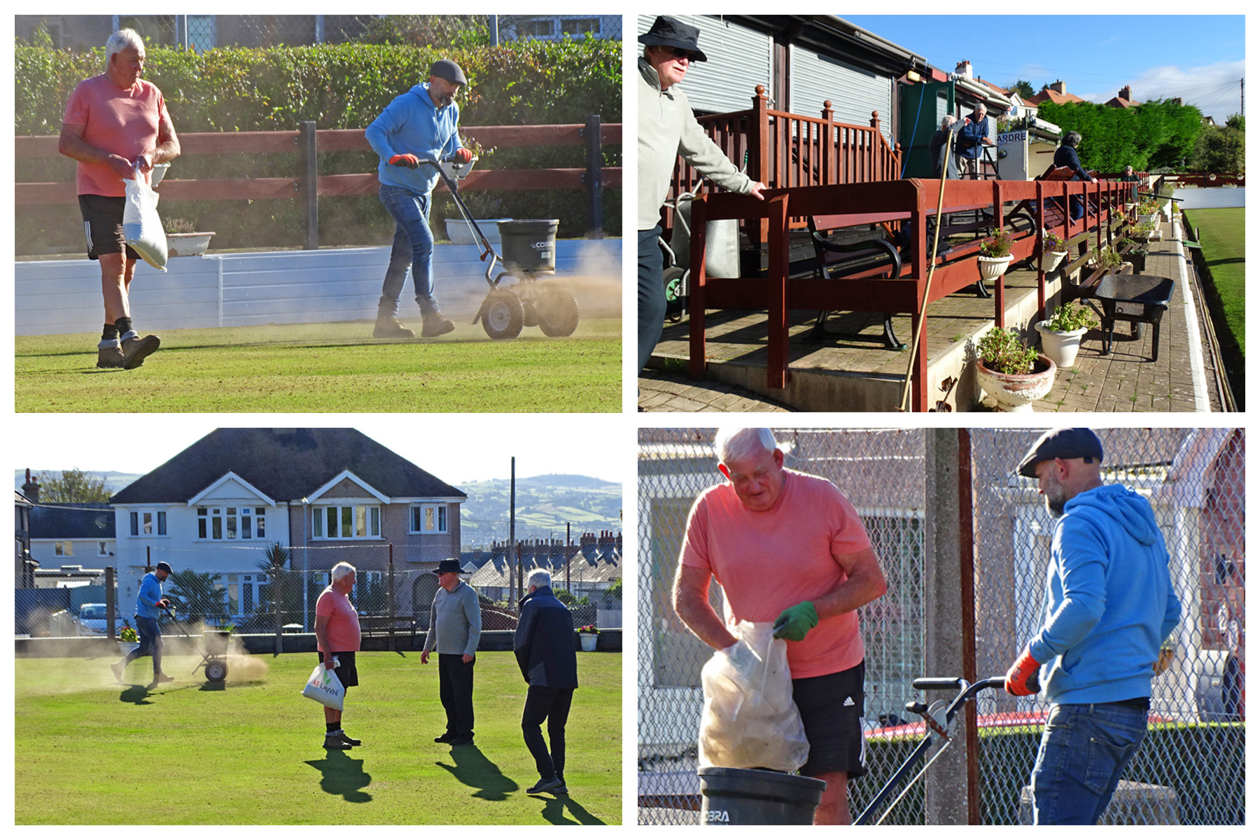 Shan & Eddie arrived to offer their customary assistance, then our only problem of the day occurred. As Bobby had ordered a more substantial type of dressing with added nutrients, etc. we found it was too thick to pass through the only spreader we had at our disposal. The only solution was to move the 40-bags the 2 Johns’ had painstakingly placed around the edges, and re-locate them actually on the green. This was an added task not envisaged but all volunteers got involved in. Once opened, Bobby (bless him) virtually spread the entire ton of dressing using his much-loved lute. Ian (Eardley) who had apologised for his late arrival in advance, arrived as the group finished off the sausage baps that Cath had prepared and brought to the green. An excellent day’s work from 9am to just before 2pm, but thankfully we had the numbers present for the more strenuous tasks early in the day, only proving the theory “many hands make light work”.