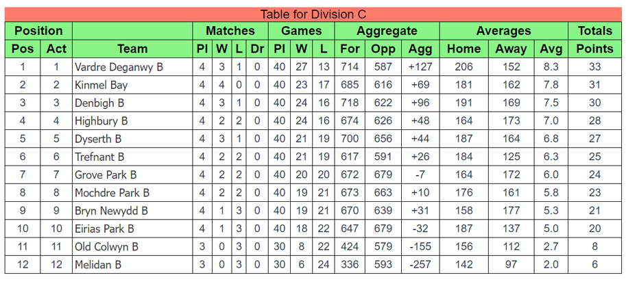 Another day of mixed fortunes in the Clwydian League yesterday. The team of the day was our ‘C’ Team that achieved a 3rd win out of 3-games played this season, resulting in the team sitting regally in 2nd place in their Division. Very well done everyone.